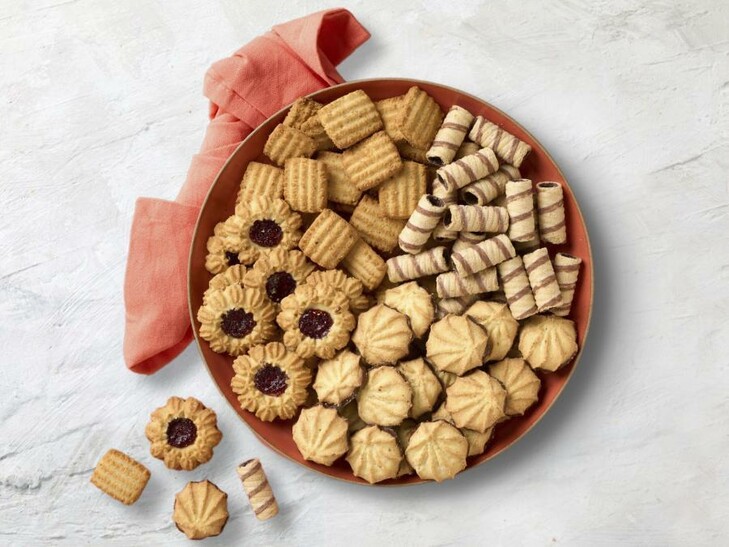 Nougat-crèmerolletje (wafel gevuld met nougatcrème (30%)), mini-berenpootjes (zandkoekjes met pure chocolade (15%)), hazelnoot-amandelkoekjes (zanddeeggebak), rode-bessenkoekje (zanddeegkoekje met appel-rodebesvruchtenvulling (20%).