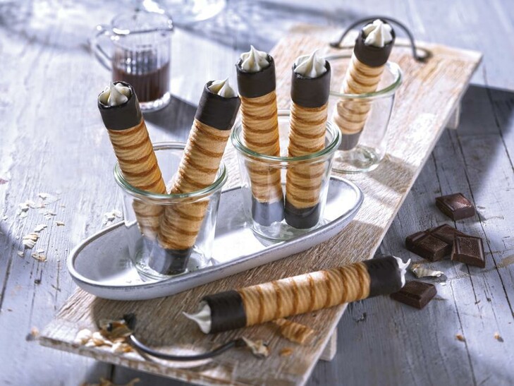 Rolletje na rolletje een genot: Knapperige wafel rolletjes met cacaoglazuur en gevuld met romig vanille-ijs.